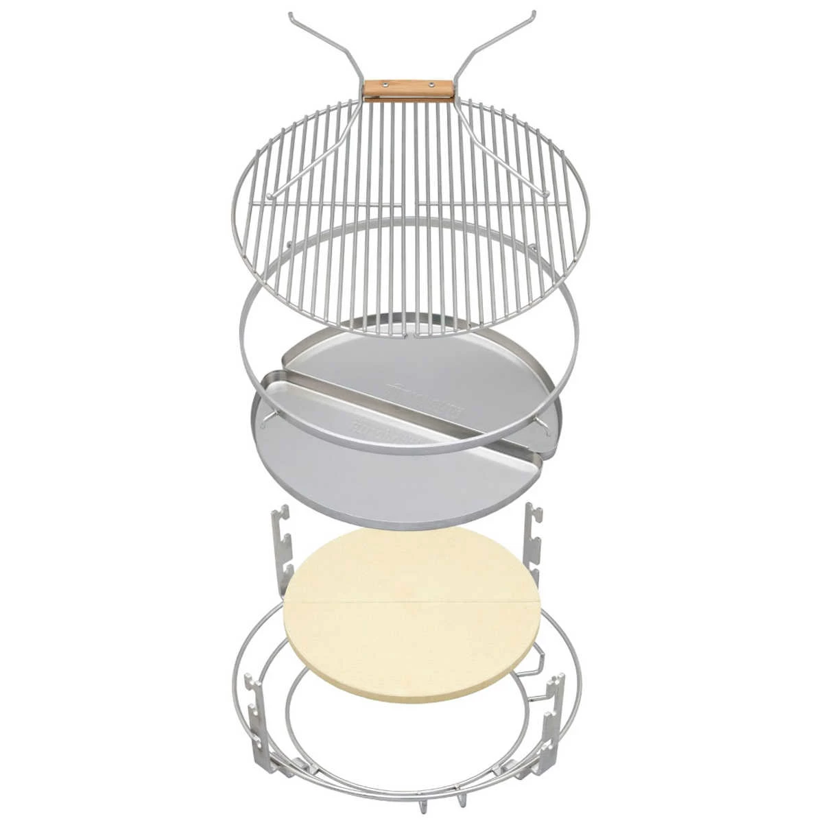 - Inhalt: 1 Griff, 2 Grillroste, 1 Ring, 2 Tropfschalen, 2 Deflektorsteine und 1 Metallrahmen