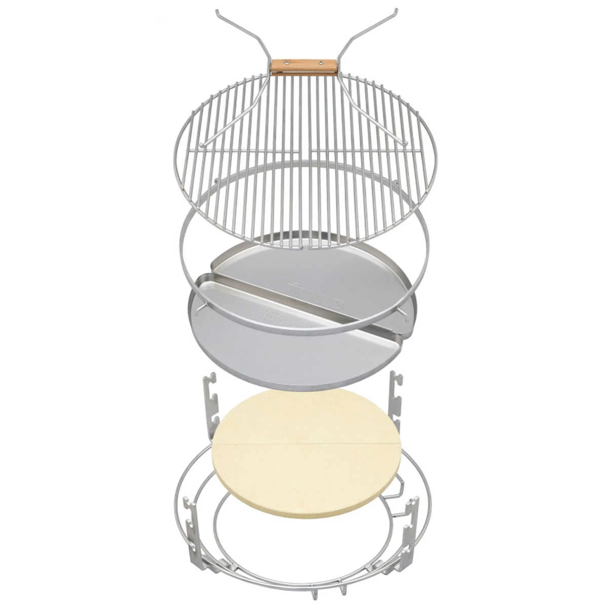 - Inhalt: 1 Griff, 2 Grillroste, 1 Ring, 2 Tropfschalen, 2 Deflektorsteine und 1 Metallrahmen
