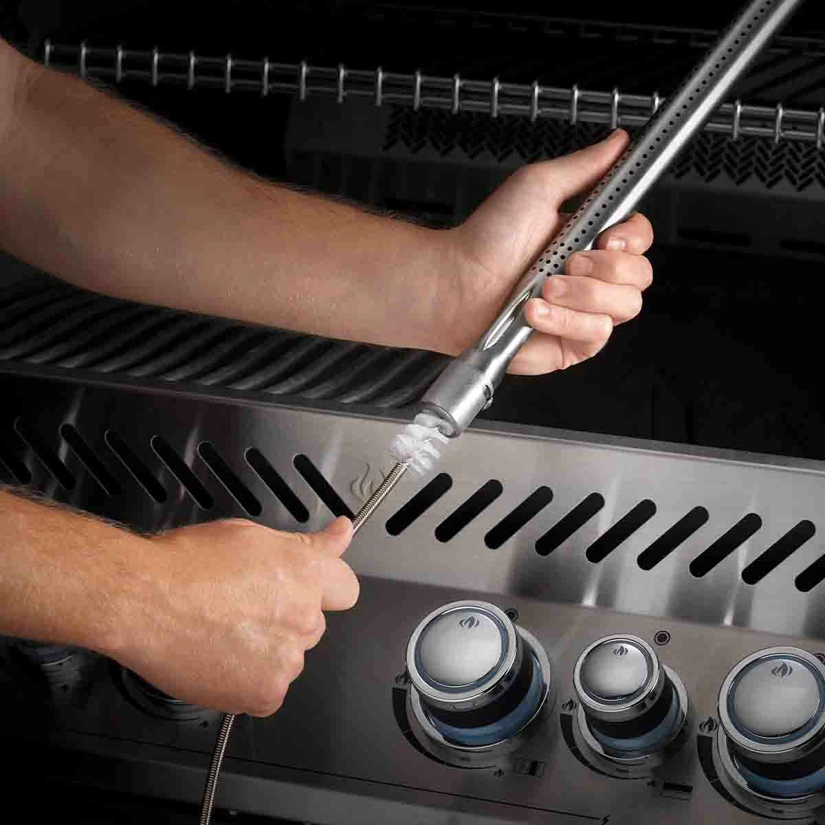Dreiteiliges Napoleon Reinigungsset, bestehend aus: Tube Cleaner zum Reinigen des Brenners von innen – bei Ablagerungen oder Spinnenbefall (67 cm x 2,9 cm). Brenner-Bürste für die Außenreinigung der Brenner. Mit stabilen Edelstahlborsten und rund geformtem Schaber für eine gründliche Reinigung (38 cm x 6 cm x 6,9cm). Schaber für die Grillkammer aus Kunststoff mit herausnehmbarem Dorn für die Brennerdüse (29,5 cm x 7 cm x 3,2 cm).