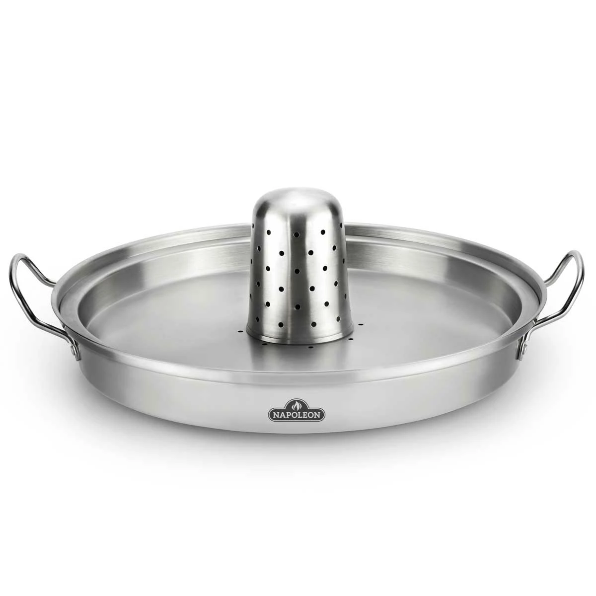 Das clevere Grillzubehör für das all inclusive-Bierdosenhähnchen: Ein komplettes Menü aus Brathähnchen, Beilagen und Sauce könnt Ihr mit dem Napoleon Hähnchenbräter ganz leicht zubereiten. Das 3teilige Set umfasst einen Pfanne mit flachem Boden, einen Deckeleinsatz sowie einen Aromakegel und verleiht Eurem Geflügel einen herrlich saftigen und aromatischen Geschmack.