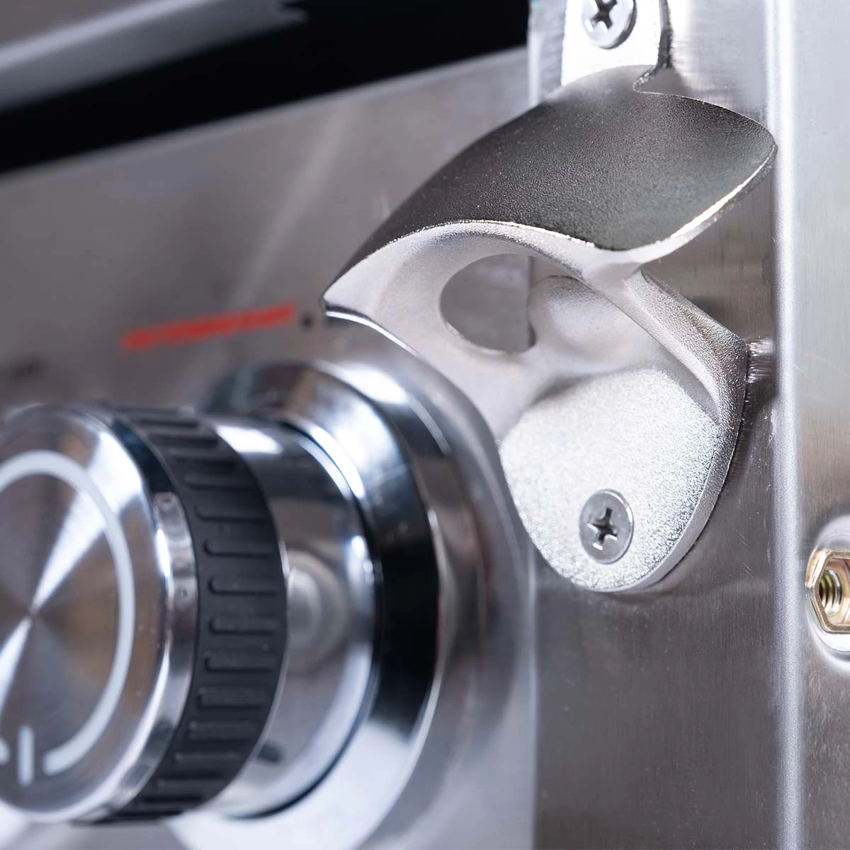 Für das wichtigste Grillutensil, die kalte Flasche Bier, gibt es jetzt einen Flaschenöffner im Grill integriert. Kein lästiges Suchen mehr, einfach stielecht die Flasche am Grill öffnen.