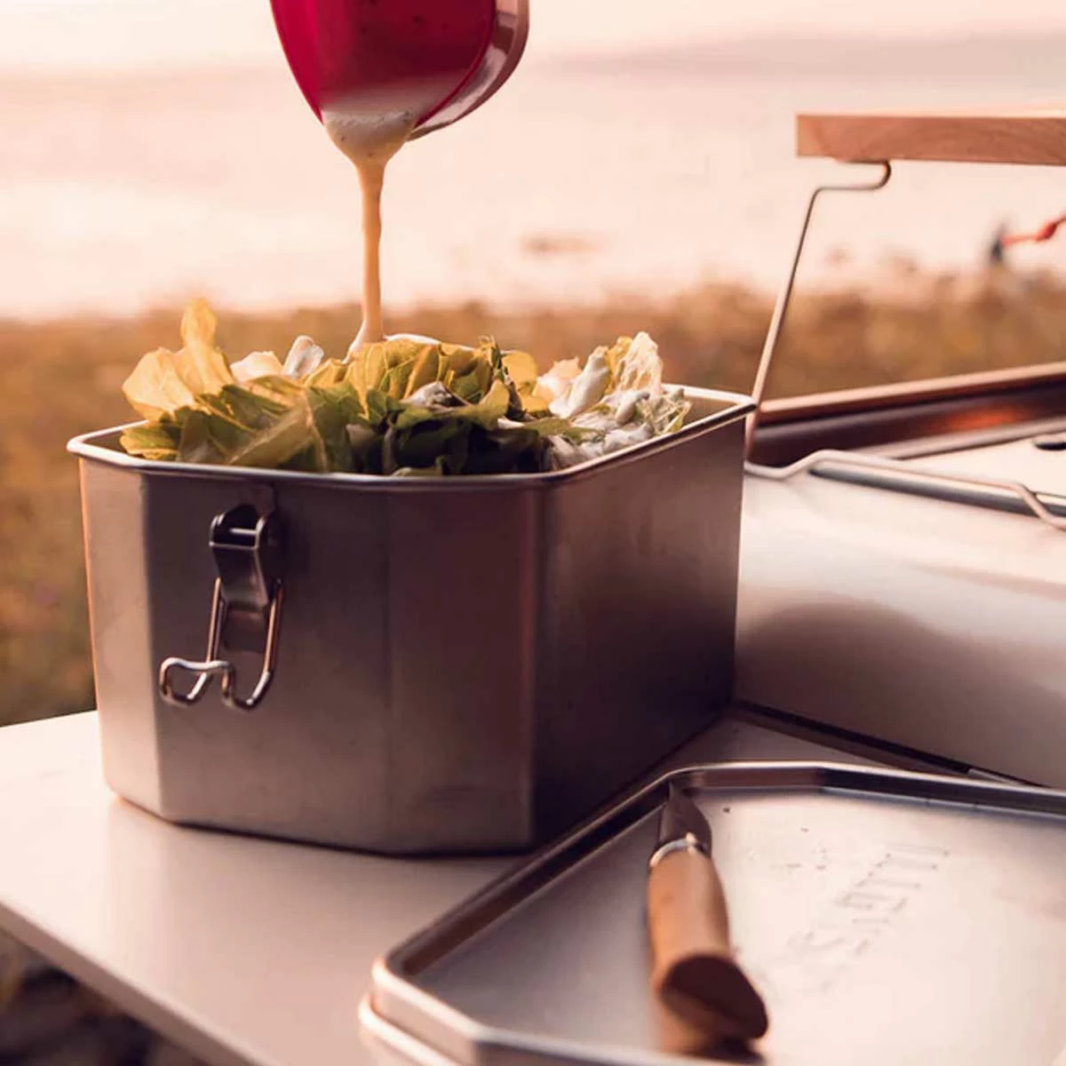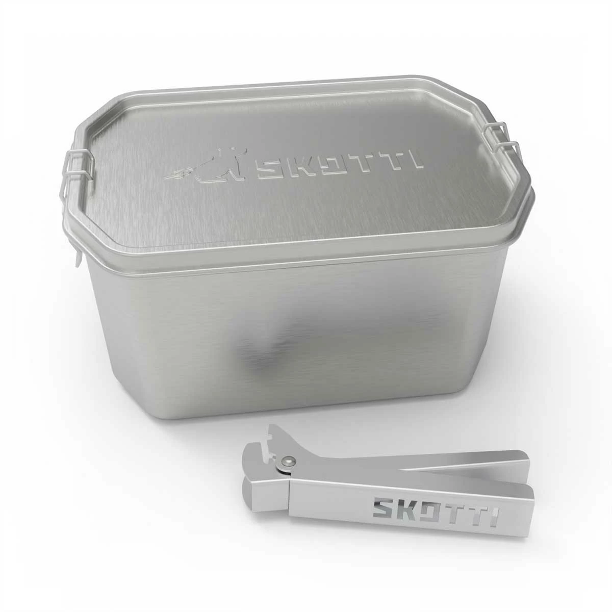Mit der Skotti Boks verwandelt Ihr Euren Skotti Grill in eine kleine Outdoorküche zum Grillen, Kochen, Braten und Schmoren. Die robuste Edelstahldose mit dem dicht schließendem Deckel und einem praktischen Greifer aus Aluminium kann äußerst vielseitig verwendet werden und ist ein geniale Erweiterung für Euren Skotti Grill.